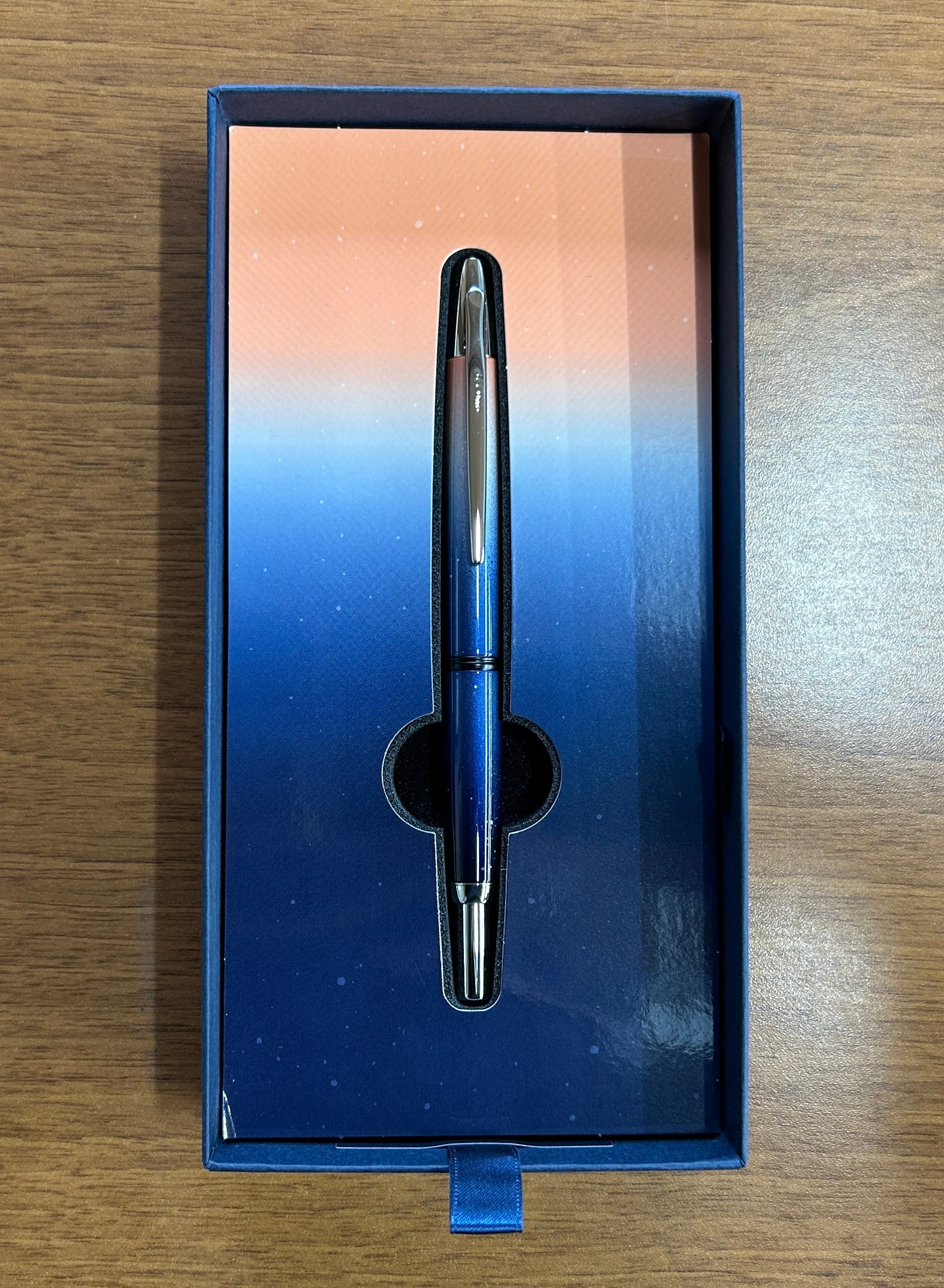 創業者の「海外進出への航海」をテーマに「夜明けの星空」を表現したデザインをモチーフとし、ボディカラーをダークブルーからコーラルピンクへ変化するグラデーションで表現しました。夜明けには「はじまり・未来への期待感」、星空には「夢・希望」という意味も込められています。ペン先は18金仕様、ペン種は細字、専用ケースに収められた特別仕様となります。
